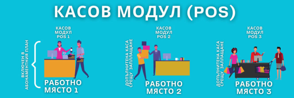 => Вие имате три работни места, в които ще извършвате продажби. Имате нужда от три активни касови модули. Първият касов модул (POS 1) е включен в абонаментния Ви план. Вторият (POS 2) и третият касов модул (POS 3) са POS срещу допълнително заплащане.
