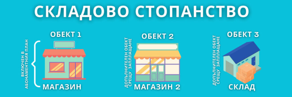 => Това са три отделни обекта. Първият физически магазин е вашия основен обект и е включен в абонаментния Ви план. Обект 2 (Магазин 2) и Обект 3 (Склад) са допълнителни обекти срещу заплащане.