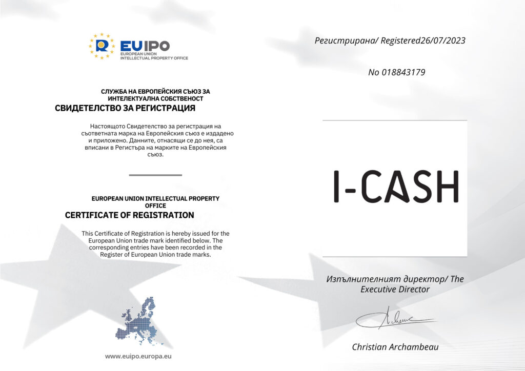 „I-CASH“ е официално регистрирана търговска марка в Службата на Европейския съюз за интелектуална собственост (EUIPO).
