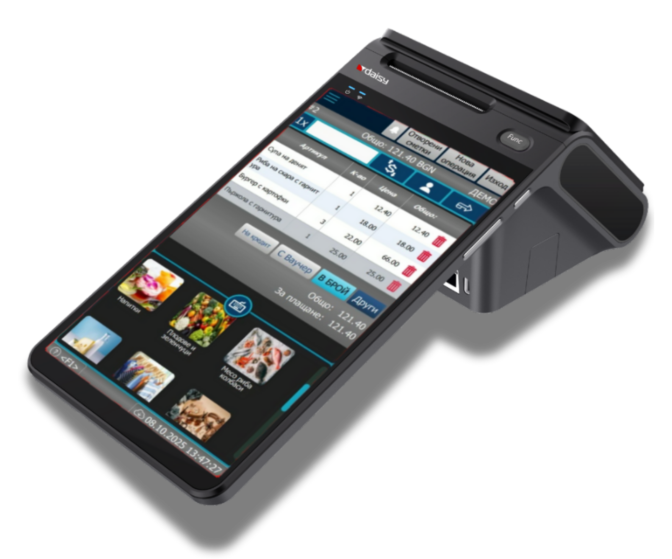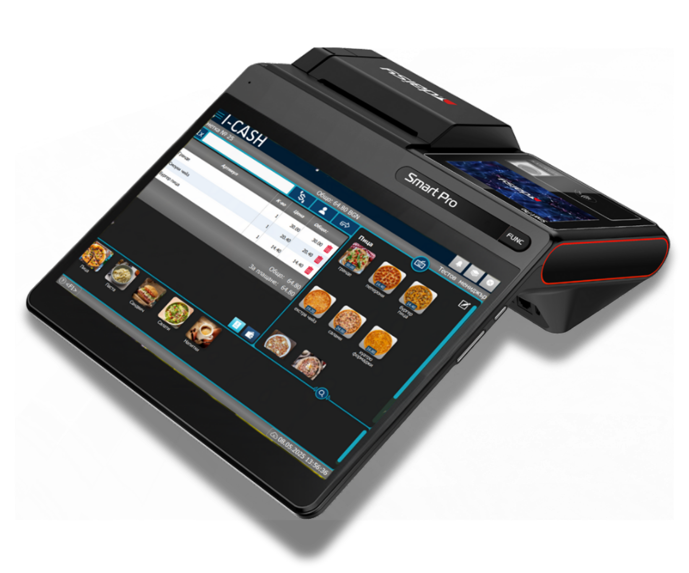 Android 13 OS. Основен екран 10″ + клиентски дисплей 4″. Octa-Core 2 GHz процесор – до 200 % по-бърз от стандартни POS терминали