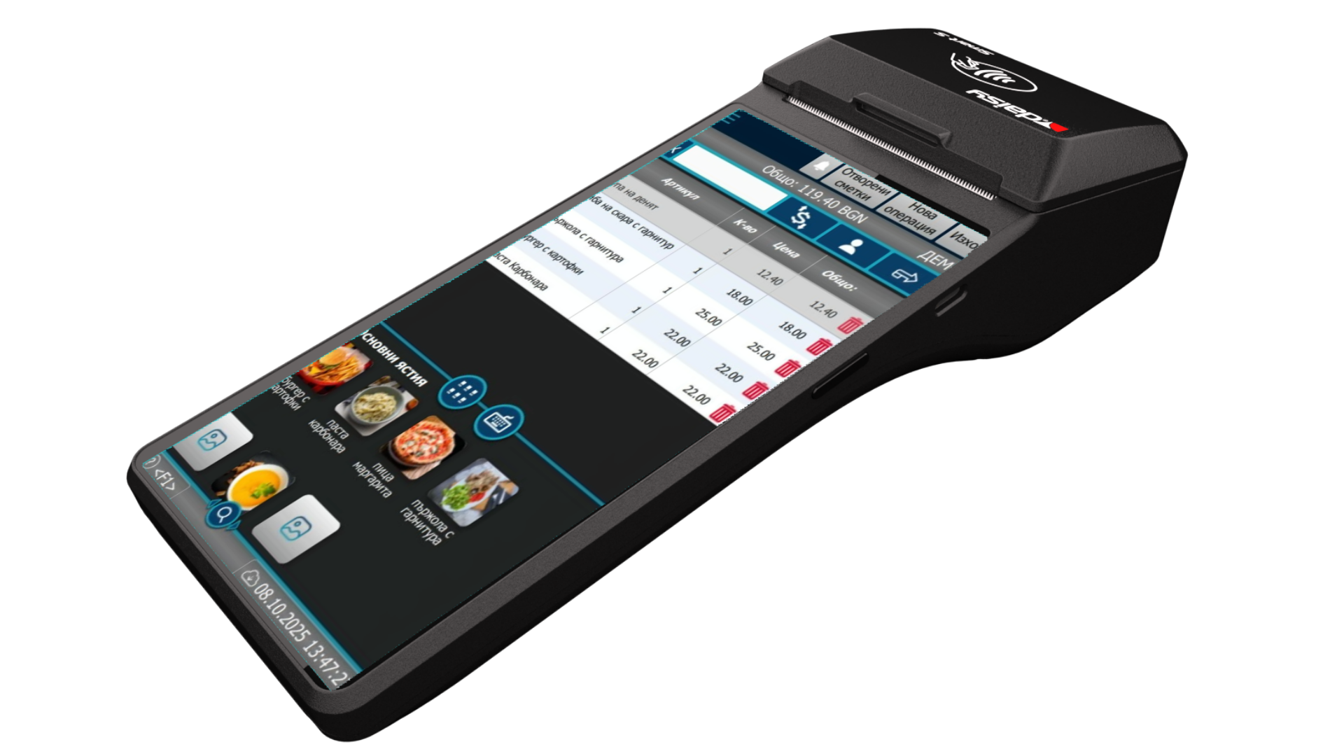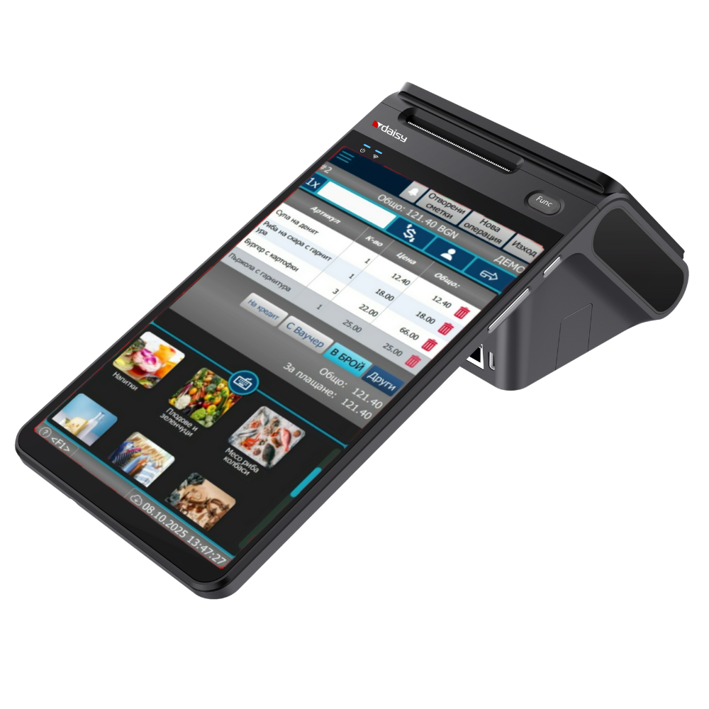 Android 13 OS. Основен екран 10″ + клиентски дисплей 4″. Octa-Core 2 GHz процесор – до 200 % по-бърз от стандартни POS терминали