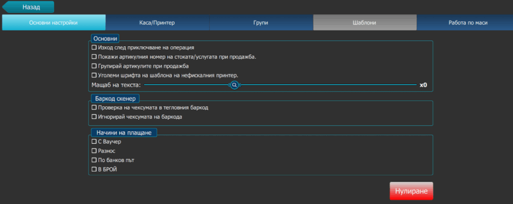 • Големи шрифта на шаблона на нефискалния принтер – увеличава големината на буквите на текста , който се принтира през нефискални принтери (кухненски принтер).