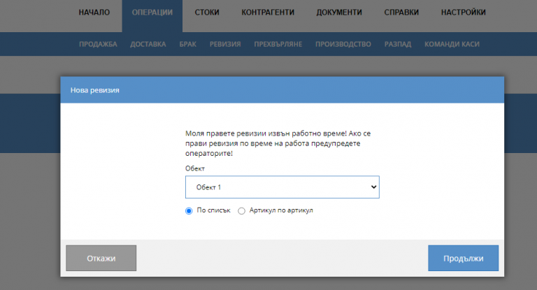 Влизате в складовото стопанство и избирате от основното меню Операции – Ревизия и Нова, за да стартирате операцията. Преди да започнете, избирате обект, ако разполагате с (или имате достъп до) няколко склада. След това трябва да маркирате един от двата вида: