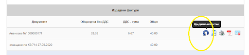 Преди да създадете рекламация към продажба с авансова фактура, която все още няма издадена крайна фактура, е нужно първо да се кредитира аванса. Това се случва от поле „Издадени факури“ и синята стрелка за „Кредитно известие“ срещу реда на авансовата фактура: