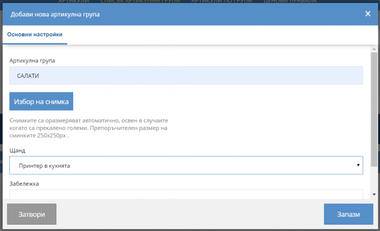 Например всички артикули от група: салати, топли и студени предястия, основни ястия, десерти и т.н. би трябвало да се обвържат с щанд Кухненски принтер. Избирате всяка една от тези групи и маркирате щанд Кухненски принтер (виж сн. „Щанд“).